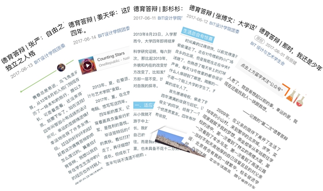 为进一步巩固德育答辩成果,辅导员撰写了自己的“德育答辩”论文,通过微信平台进行全学院范围内推广,得到院内外师生分享转发,对学生进行自我反思和总结起到积极引导作用。同时,学院也通过微信平台将2017届毕业生中在学习成绩、学生工作、科技创新等表现突出的同学的德育答辩论文进行推送,扩大影响,共推送文章5篇,阅读量超过3000次。此外,为营造温馨的毕业季氛围,学院收集2017届毕业生四年前入校时照片和家长寄语照片制作视频,帮助学生回顾成长,感恩父母。