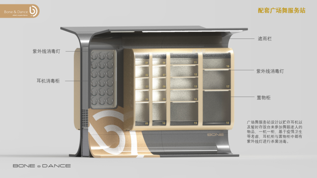 配套广场舞服务站设计说明:广场舞服务站设计以贮存耳机以及暂时存放台来参加舞蹈老人的物品,一机一柜,基于疫情卫生等考虑,耳机柜与置物柜中都有紫外线灯进行杀菌消毒。