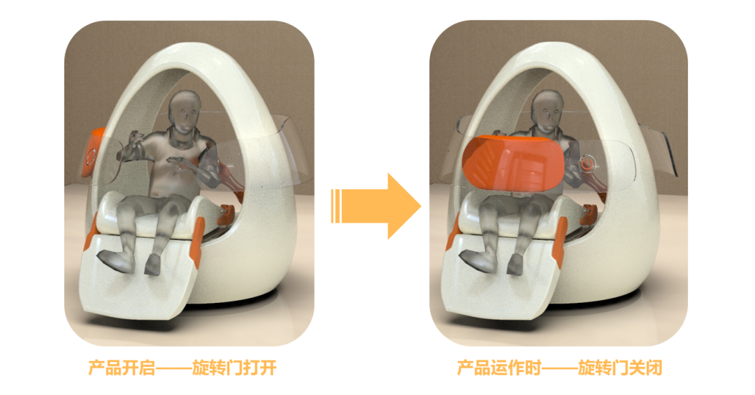 设计说明:希望通过设计,帮助老年群体更便捷、安全的完成独立洗浴,减少老年人因洗浴造成的心理波动,给予更多的人性关怀。背部持有清洁机械手臂,独特的感应背部擦洗面板,旋转式启动关闭门,机器内部循环通风消毒烘干系统 ,加增传统淋浴头方便各处冲洗,椅面以及机器内部排水系统,带来更好的洗浴体验。
