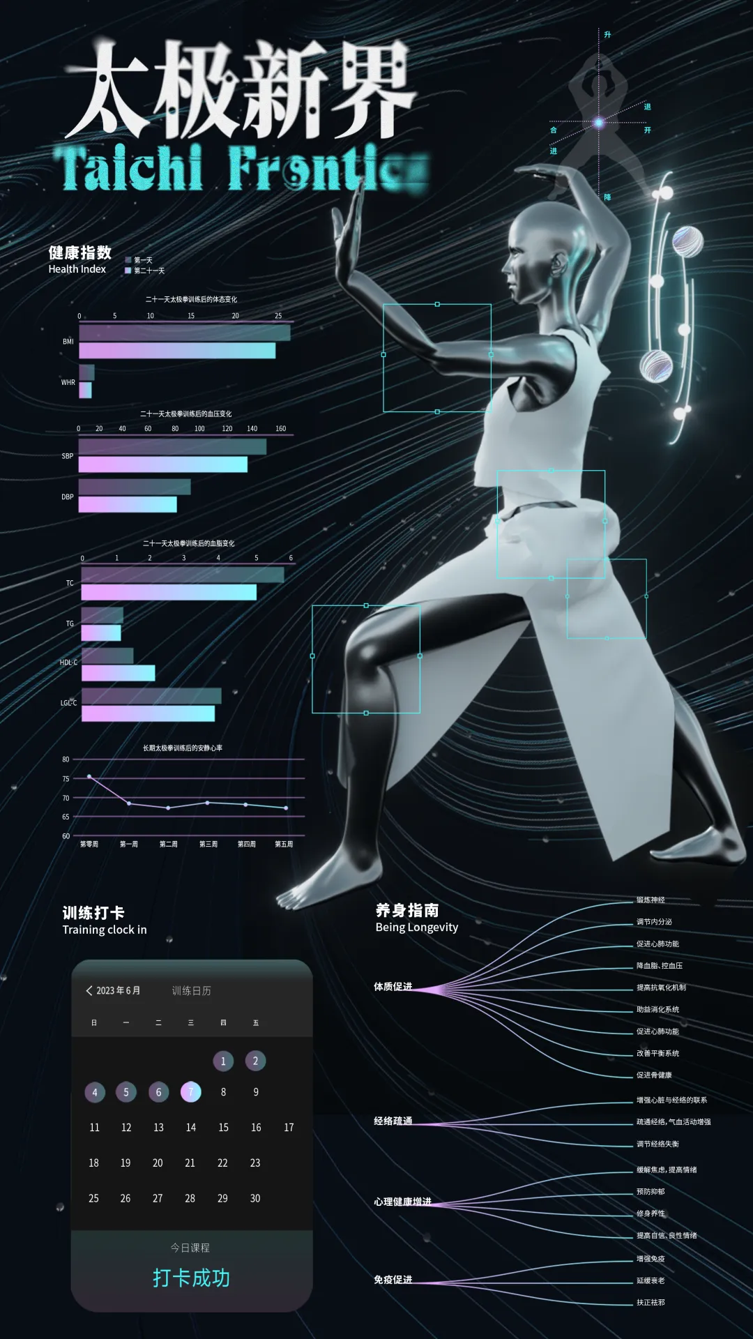 太极新界是以网页为载体,面向年轻人的太极拳学习页面。通过新潮的科普见面,实时互动、健康打卡和评价身体健康等功能建立一个太极拳元宇宙,旨在吸引年轻人参与太极拳的实践并享受其带来的健康益处。在视觉上,为了体现新界即从二维到三维、传统到现代,我们打破太极黑白的固有色彩,使用青色、玫红色打造一个赛博太极世界。通过结合现代科技与传统太极拳的智慧,太极新界致力于打造一个互动性强、内容有趣、操作简单的太极拳学习与交流平台,利用换装、换场景等奖励机制鼓励年轻人积极参与并享受太极拳的乐趣,让年轻人主动接纳太极拳,让太极拳在年轻群体火起来。