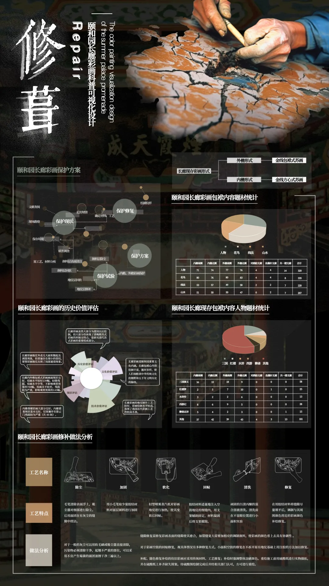 颐和园长廊是颐和园中匠心独运的一大手笔,代表了中国园林建筑的高超水平。颐和园长廊几乎所有梁枋的表面都有丰富多彩的绘画,是我国独一无二的遗产。文化遗产裹挟在快速发展的洪流中,在技术日新月异变革的今天,AI技术不断更迭的当下,内涵并没有被改变。在设计中,我们以APP为展示手段,AR为辅助手段,对彩画进行科普可视化设计。对古画进行补绘及动效制作,通过APP与人产生交互,从而达到科普展示的效果,加深公众对于颐和园长廊彩画的了解。